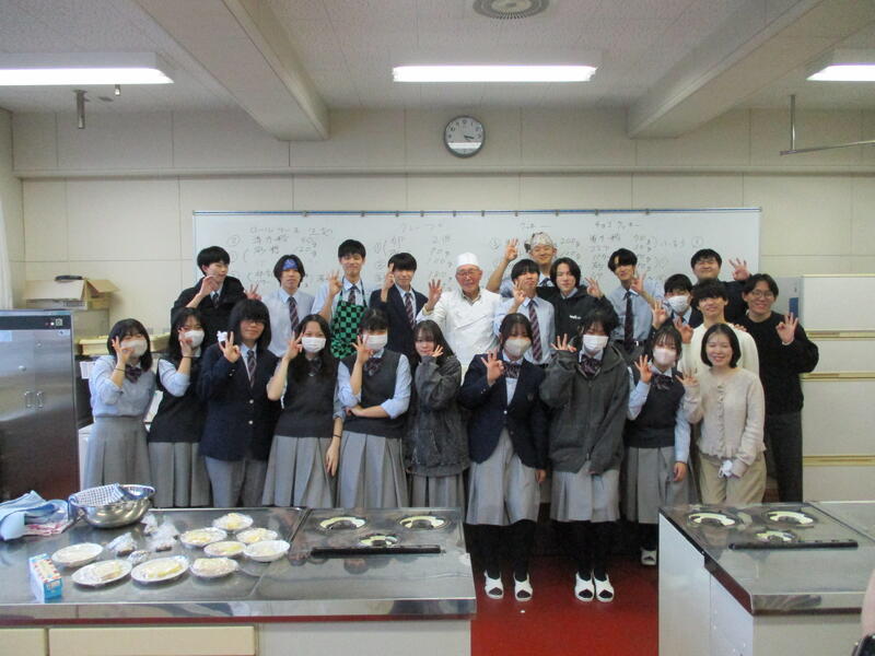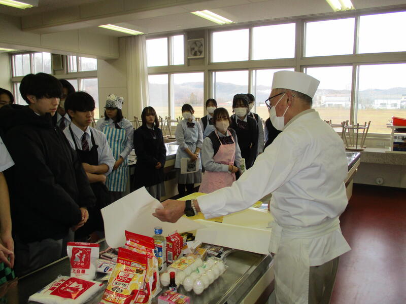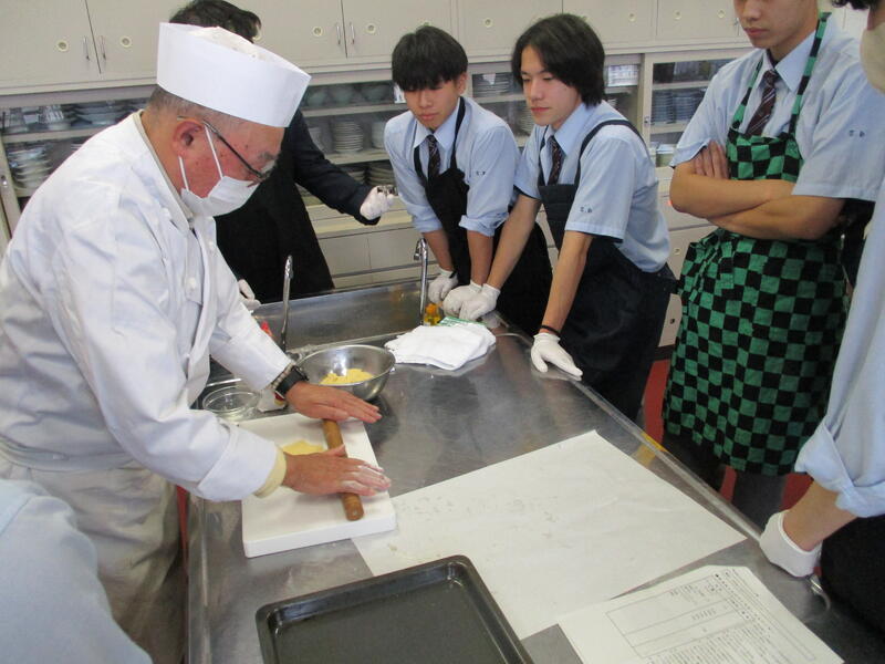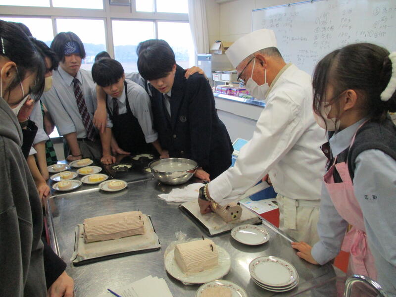 11月28日(金)3校時~6校時にかけて、本校調理室にて地元の洋菓子店「ケーキの銘菓しのはら」さんに協力・来校していただき、津別町の特産物としての商品化を見据えて「ロールケーキの試作」を行いました。本取組は、2年生のときの高大連携事業成果報告会における政策提言を踏まえて構想を進めているもので、今回は、北大HALCCの学生も一緒に入って試作の活動を行いました。