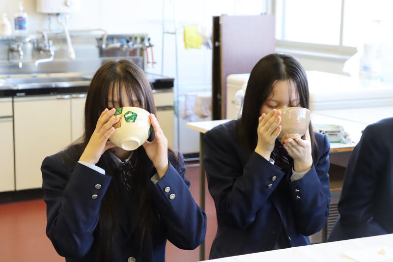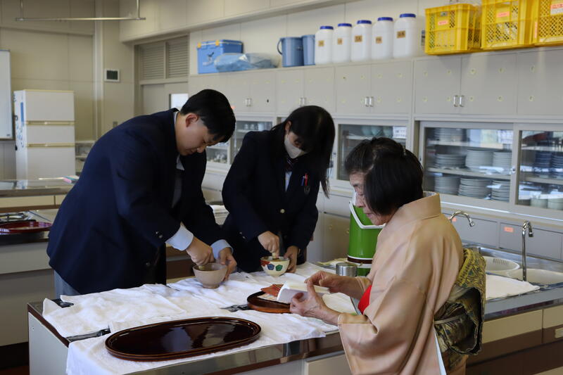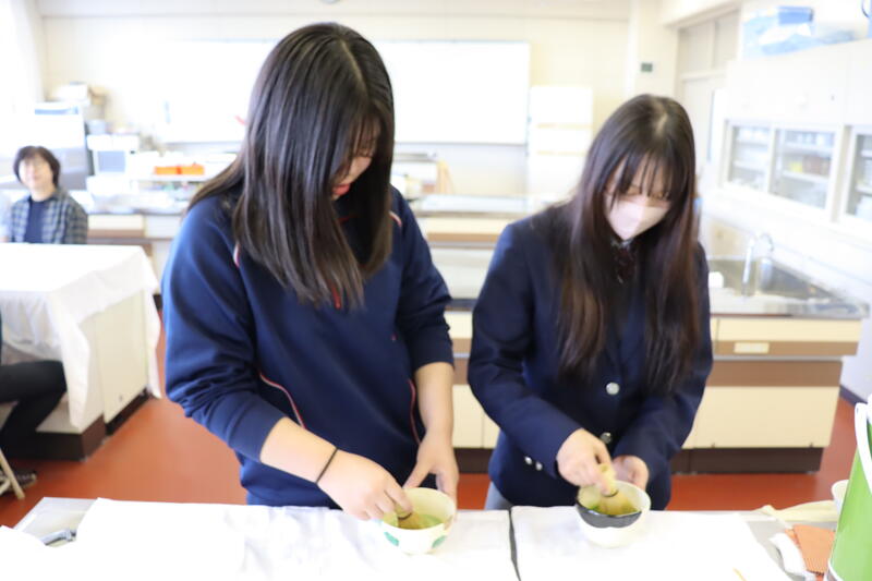 10月30日(木)5・6校時の3年生家庭科「生活教養」の授業に、地域で「茶の湯」の催しを開いている増田佳子さんを講師にお迎えし、「茶道教室」を実施しました。ほとんどの生徒たちにとっては、初めて茶道の作法を学ぶ機会となり、いただいた茶菓や抹茶の味にそれぞれ感想を言い合っていました。
