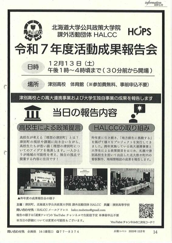 北海道大学公共政策大学院課外活動団体HALCC 活動成果報告会.(令和7年12月13日(土)13:00~本校体育館にて実施)